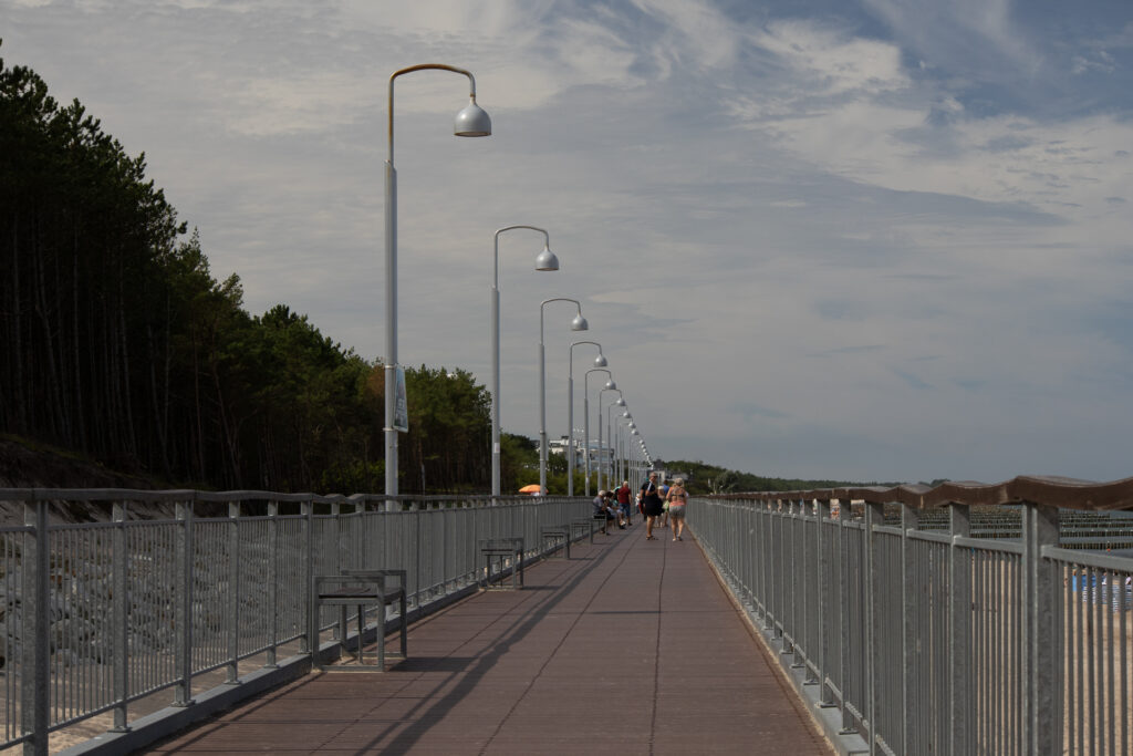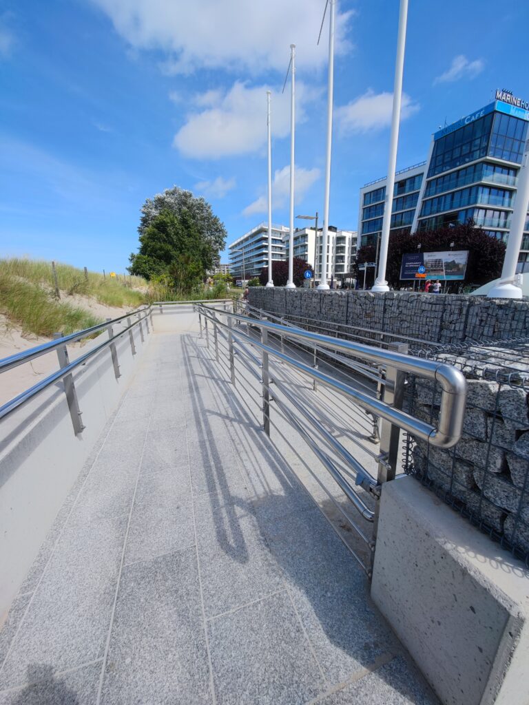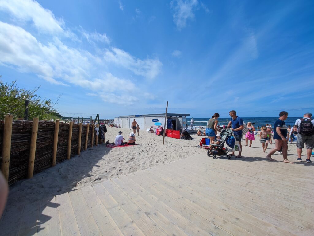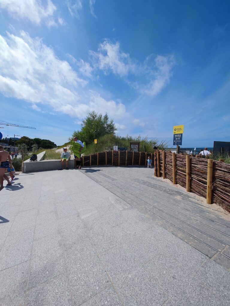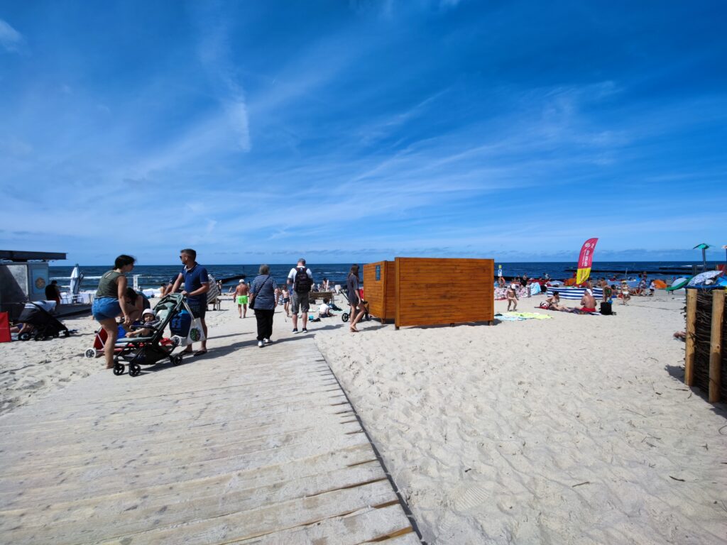 Poza spacerami i zwiedzaniem straganów Mielno może zaoferować jeszcze sporo lokali gastronomicznych, z których zdecydowana większość jest przystosowana dla niepełnosprawnych albo po prostu ma ogródki na zewnątrz – i do tego wcale nie trzeba długo szukać by uniknąć „paragonów grozy” – zresztą Książulo zrobił na ten temat ostatnio filmik, więc polecam sprawdzić co udało mu się zjeść i za ile. Jeśli chodzi o dostęp do plaży, to są dwa zejścia z podjazdami dla wózków – niedaleko centrum oraz w Unieściu. W obu przypadkach, oprócz podjazdów, są drewniane chodniki prowadzące w głąb plaży, chociaż nie do samego morza, a o jakiejś przebieralni czy specjalnym rowerku wodnym można zapomnieć. Takie atrakcje widziałem do tej pory jedynie w Świnoujściu. Brakowało mi też jakiegoś baru plażowego, oczywiście z dojazdem – tutaj doskonałym przykładem jest gdańska Moloteka, a ostatnio coś podobnego pojawiło się w Kołobrzegu i też jest możliwość dojechania po drewnianym chodniczku. Miejsce to jednak nie znajduje się, jakby można było przypuszczać, w centrum przy Molo, a nieco dalej na wschód, w rejonie gdzie powstają nowe… tak, zgadliście – apartamentowce. Poniżej wrzucam zdjęcia zrobione w Kołobrzegu, a zjazdy z Mielna możecie zobaczyć na wstawionych wyżej filmikach ze spacerów.