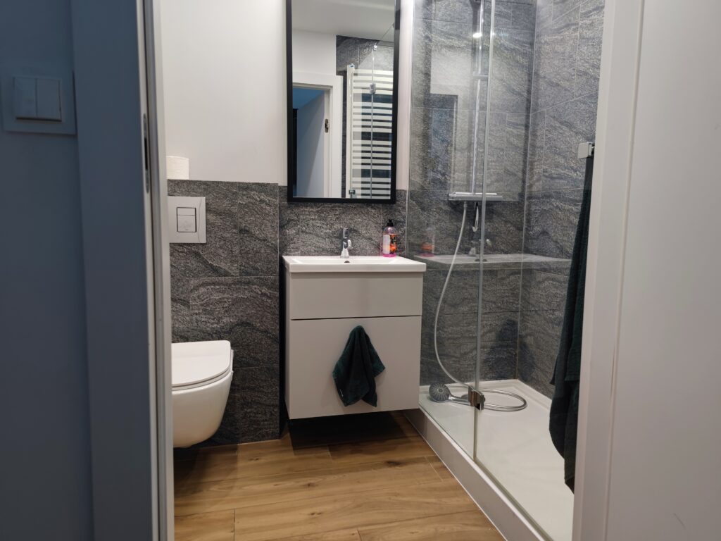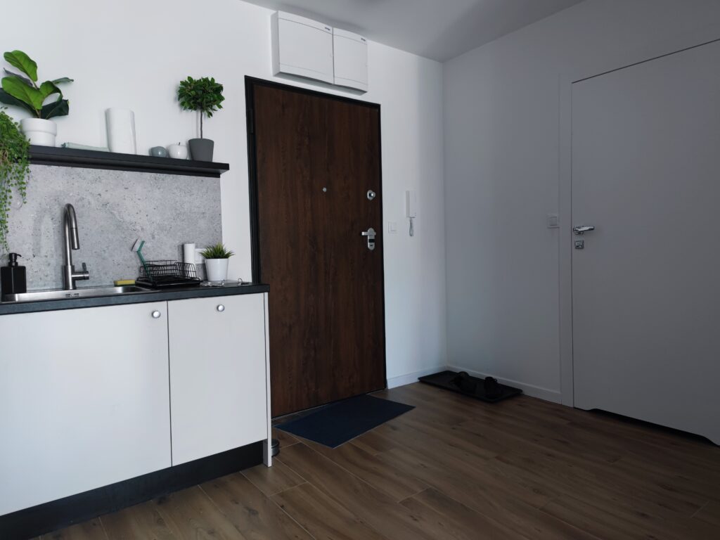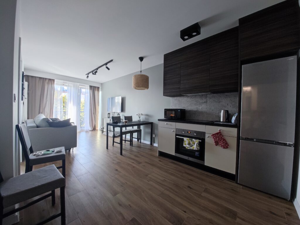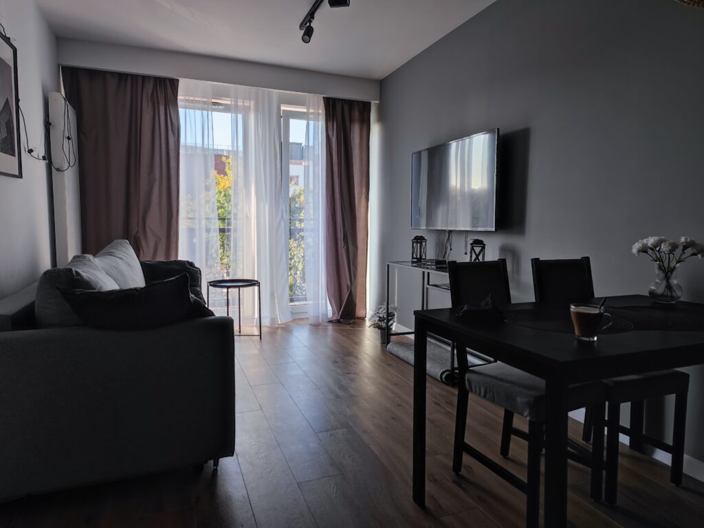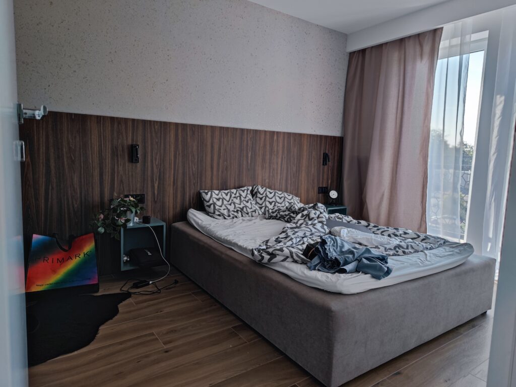 Na nocleg wybrałem apartament „Przytulny” na ulicy Targowej, obok parku Źródliska II. Apartament zlokalizowany na 3. piętrze, nie wyróżniał się jakimś szczególnym widokiem, jak to w mieście, ale miał prawie wszystko co potrzebne – był spory, z osobną sypialnią, aneksem kuchennym i niezłą łazienką, szybkim internetem i całkiem sporą liczbą kanałów w telewizji do wyboru. Jedyne czego brakowało to kawa, herbata czy choćby woda mineralna – co prawda w tym samym budynku znajdowała się Żabka, a na większe zakupy można się było wybrać do znajdującej się niemal za rogiem Galerii Łódź, ale przy cenie ok. 370 PLN za noc… no trochę się zwraca uwagę na takie braki.
