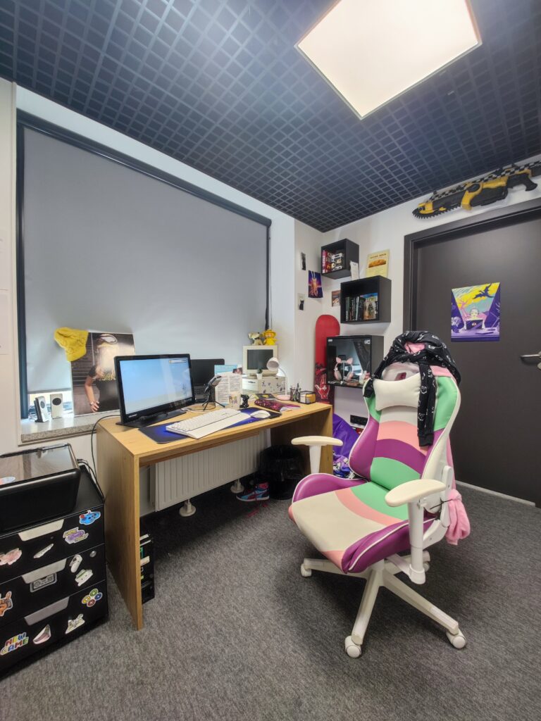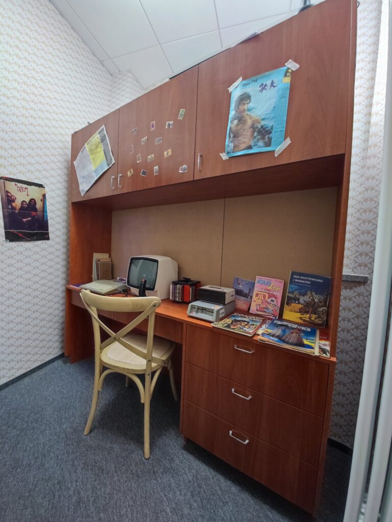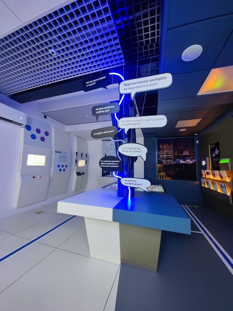 Obejmuje trzy piętra jednego z budynków, dostępne z pomocą windy, a na każdym z pięter dostępne są odpowiednie podjazdy i rampy jeśli jest taka potrzeba. Muzeum dzieli się na kilka części – ta poświęcona grom pokazuje np. wystrój pokoju typowego gracza w czasach kiedy ta branża w Polsce dopiero raczkowała, ale mamy też pokój współczesnej streamerki (sądząc po różowych uszkach na słuchawkach 😉 ), są też ekspozycje prezentujące etapy powstawania gier, z interaktywnymi elementami, które pozwalają samemu zbudować prosty model 3D czy zaplanować etap gry.